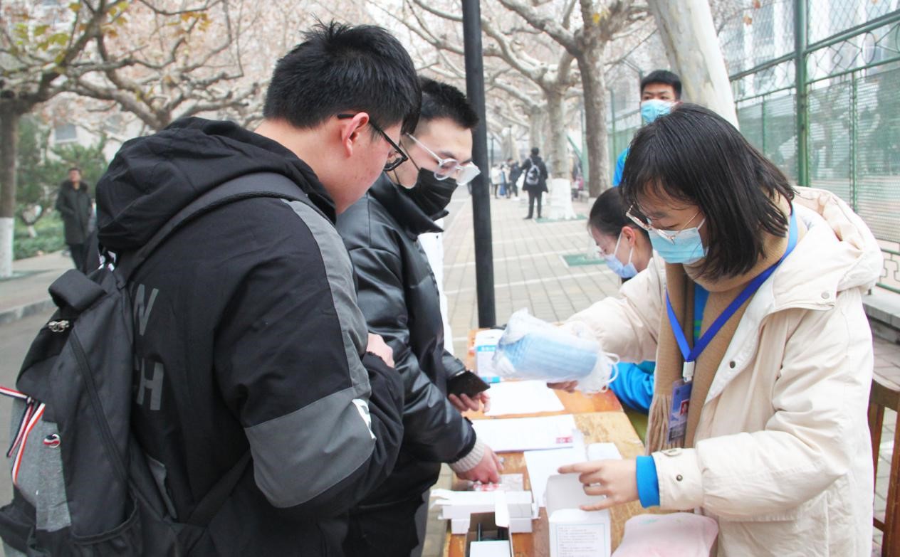 “一时马虎,忘记带口罩了,请问这里可以领取吗”“当然可以,同学,这是口罩,请拿好。”工作人员正为焦急的考生发放口罩。