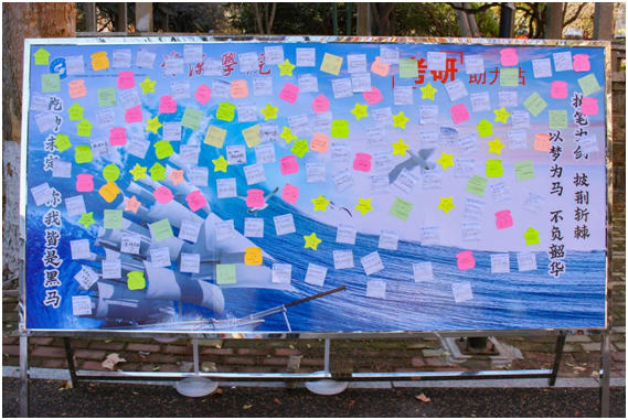 劲浪扬帆,寓意考研学子一往无前、逐梦远航;鹰击长空,祝福考研学子振翅高飞、前途广阔……展板中的每一处细节、每一项元素都承载着学院对考研学子的满满心意,殷殷祝福。