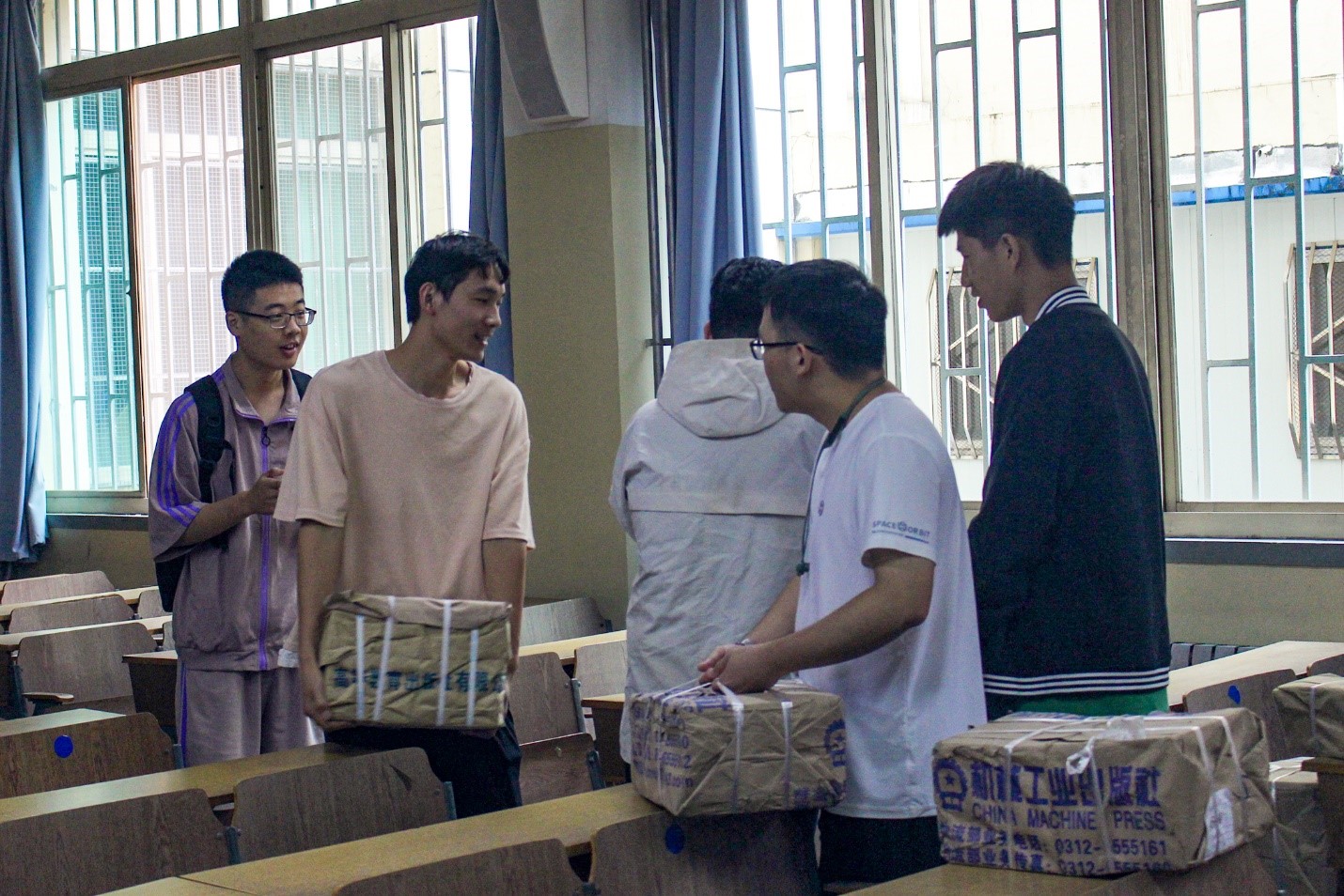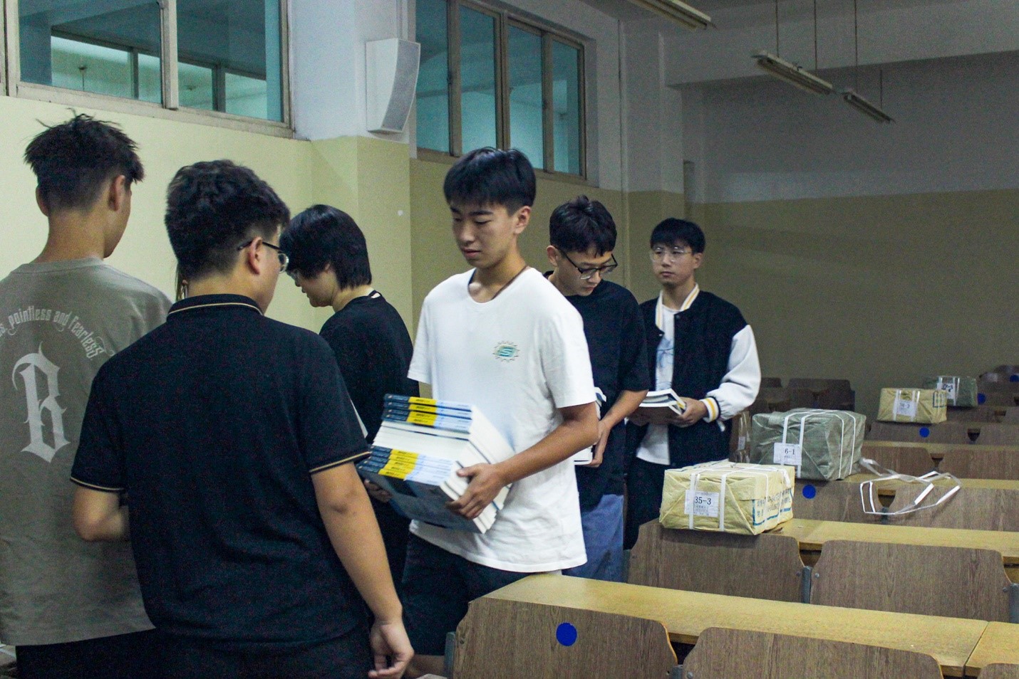 在教材发放过程中,相关负责老师下发教材清单并指导同学们做好包裹搬运、分拣、拆封等准备工作,各班级自觉排队,严格遵守流程规范进行教材的清点、核对、签字,有序领取相应教材。