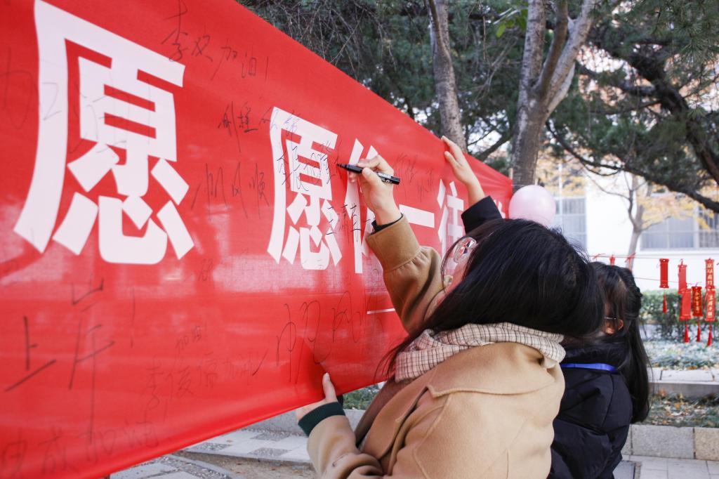 提笔书华章,落笔赴未来。老师们以笔笺情,在条幅上写下殷殷期盼;学弟学妹们纷纷在条幅上签字留念,表达对学长学姐们的真挚祝福。