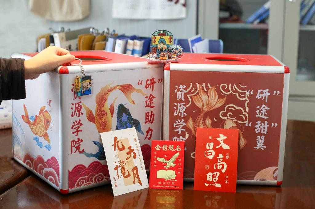 活动别出心裁,设计了“‘研’途助力”与“研途‘甜’翼”两款盲盒。活动现场,考研学子在装满祝福的盲盒前驻足停留,分别抽取独一无二的明信片、代表金“棒”题名的棒棒糖、“考神附体”的亚克力摆件和“逢考必过”的钥匙扣。一张张明信片上的真诚祝福、寓意苦尽甘来的棒棒糖等礼品,使考研学子感受到了深深的温暖与关怀。