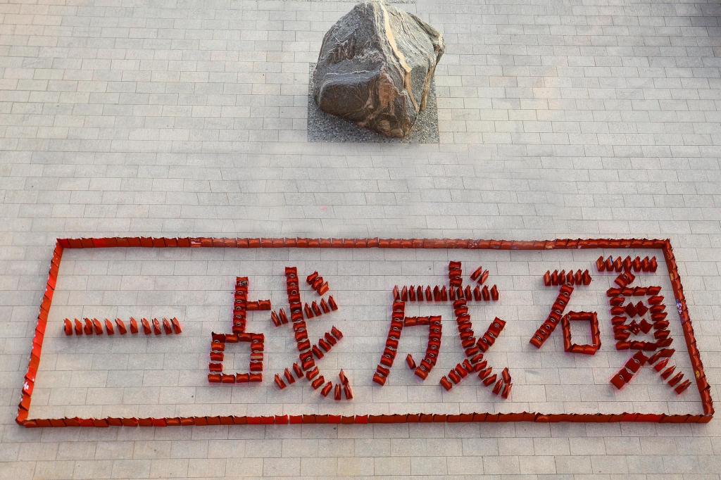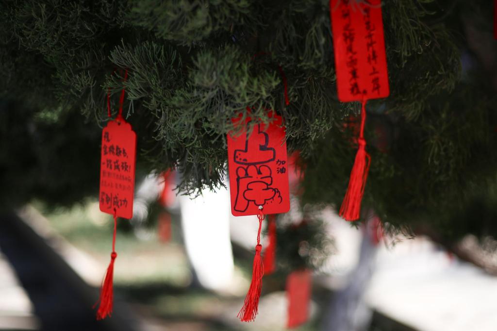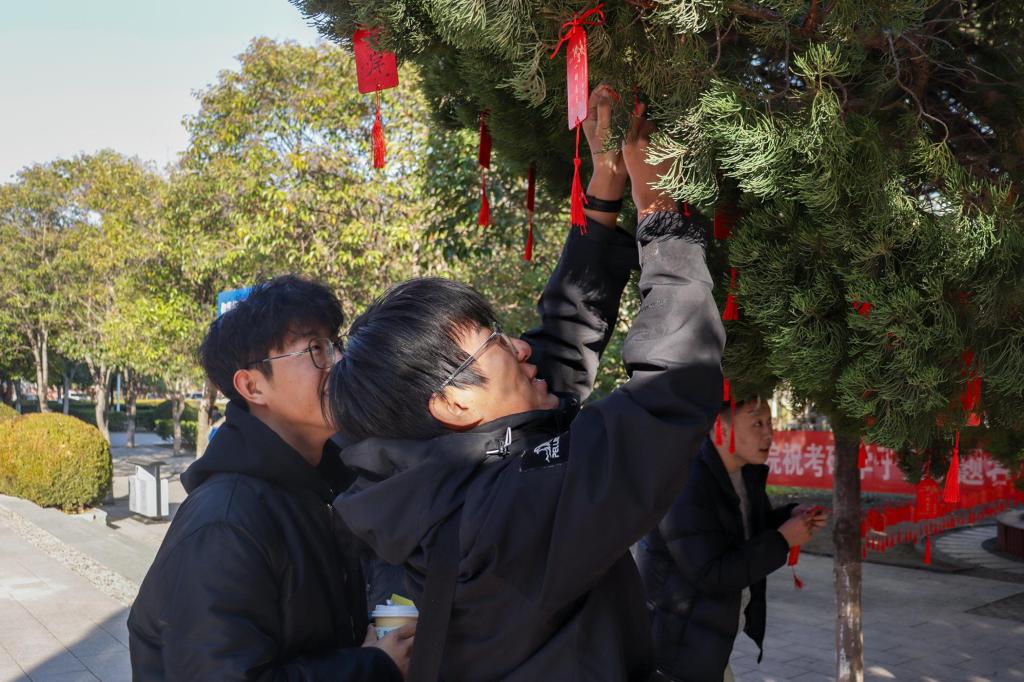 一块块写满“金榜题名”“旗开得胜”“研途星光,不负你我”等寄语的祝福牌,悬挂在小花园附近的树梢上、走廊旁。路过的考研学子停下匆忙的脚步,精心挑选心仪的祝福牌,分享祝福,感受喜悦。