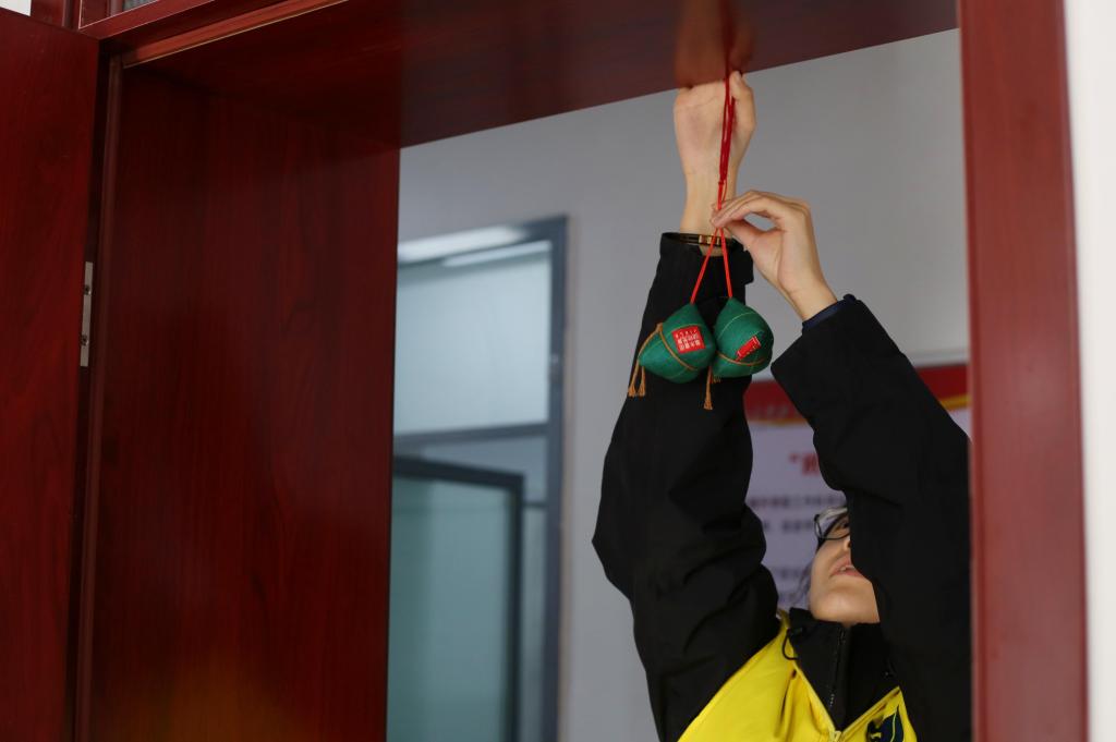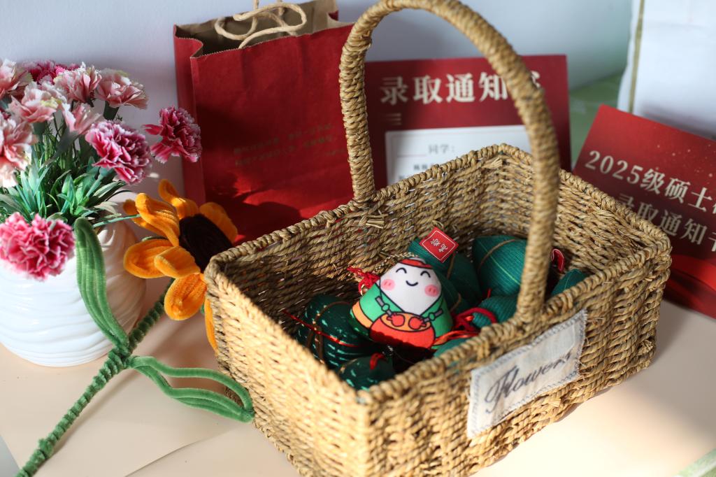 学院组织志愿者将粽子形状的香包逐一悬挂在考研自习室门框上方,寓意“一举高粽”。同时,志愿者在每位考生书桌上摆放“高粽”挂件,放置“高粽”胸针,祝愿他们能够在考研之路一帆风顺,勇夺桂冠。