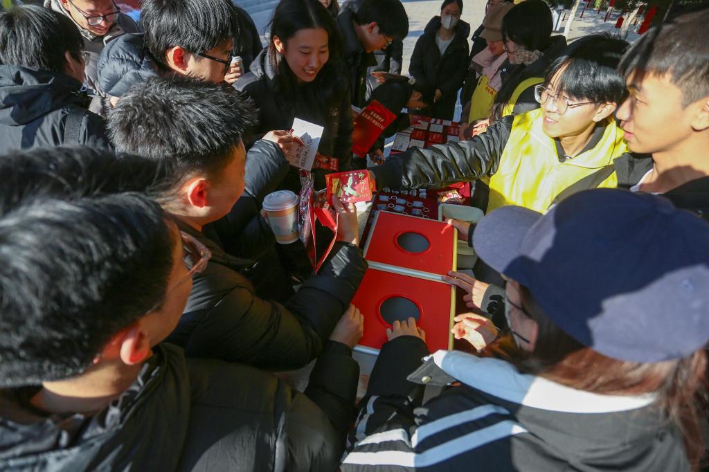 活动现场,考研学子在装满祝福的盲盒前驻足停留,抽取独一无二的明信片、代表金“棒”题名的棒棒糖、“考神附体”的亚克力摆件和“逢考必过”的钥匙扣。一张张明信片上的真诚祝福、寓意苦尽甘来的棒棒糖等礼品,使考研学子感受到了深深的温暖与关怀。