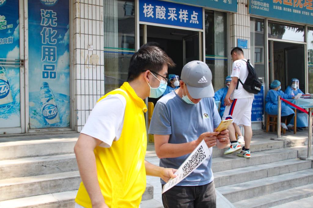 在核酸检测现场,从千余人集合到操场的全员检测,到每天坚持百分之二十的抽检,再到两天一次全员核酸检测,每一名学生党员坚持脚不停、口不停、手不停,提前做好物资清点,前后奔走维持现场秩序,帮助医护人员确认个人信息,做好核酸检测人员现场扫码确认、耐心提醒前来检测的师生做好个人防护、注意“一米”间距等工作。在核酸检测工作中,处处可见的“黄马甲”已经成为了校园内一道亮丽的风景线,彰显了青春的奋斗与作为。据悉,他们平均每天参与核酸检测志愿服务5小时,目前为止已经参与了七十余次核酸检测志愿服务,平均每次出勤8人,志愿服务人员共计260人,总服务时长400余小时,总服务人次达数千次。在平衡好学习与志愿服务关系的同时,他们顶着夏日的骄阳,风雨中“逆行”而上,始终坚持全心全意为师生生命健康安全服务的根本宗旨,担当作为,踏实肯干,彰显了“奉献、友爱、互助、进步”的志愿服务精神。