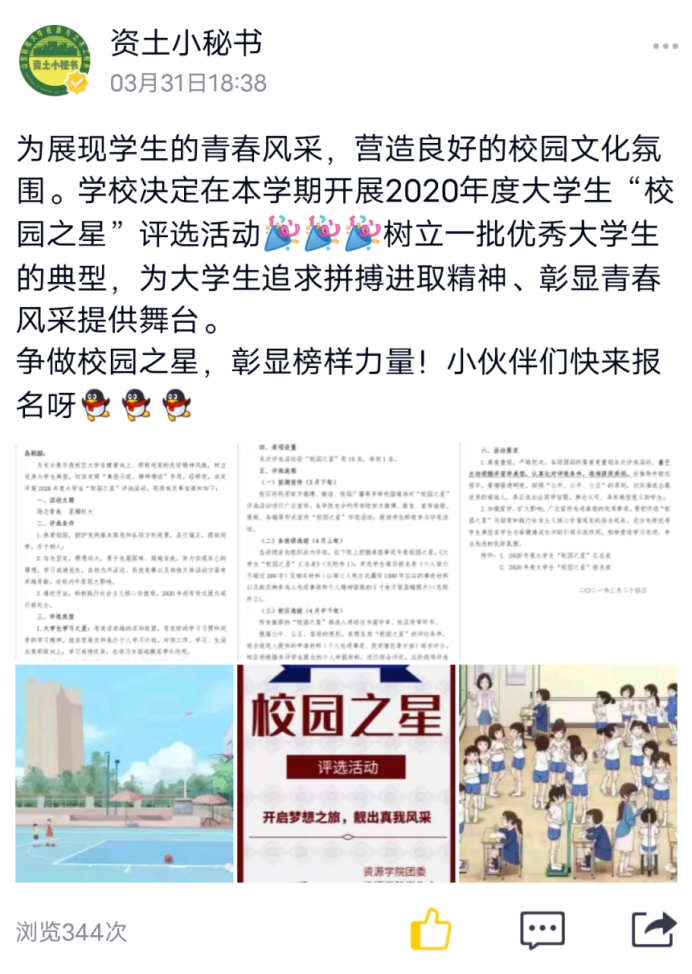 为响应校区关于开展2020年度大学生“校园之星”评选活动的通知要求,引导学院学生向榜样看齐、向先进对标,德赢Vwin官方区域合作伙伴大力打造“线上+线下”融媒体阵地,让评选活动宣传工作全面覆盖到学院学生群体中。