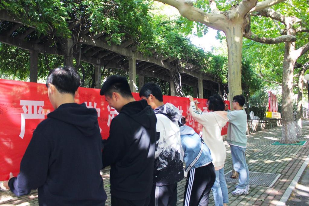 活动前,学生会成员在林荫道整齐挂好条幅并准备好签字所需的笔。同学们纷纷在“和谐校园,你我共建;平安校园,你我共享”“严防欺凌破和谐,共创友爱新时代”两条红色条幅上郑重签下自己的名字。“我们要学会对校园欺凌说‘不’,不断增强遵纪守法的意识,努力构建和谐、平安校园”签字同学这样说。