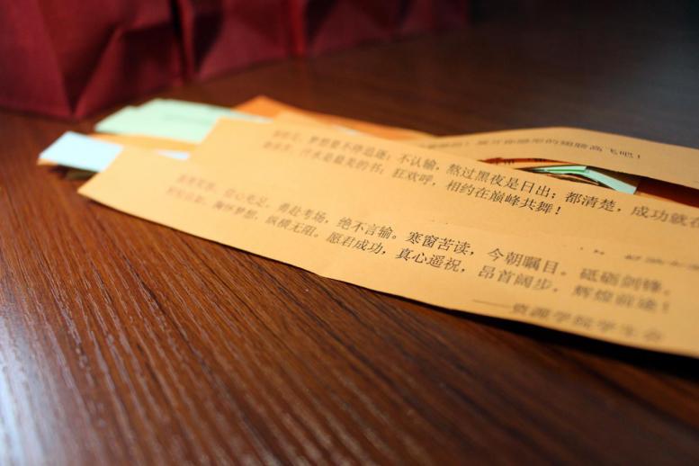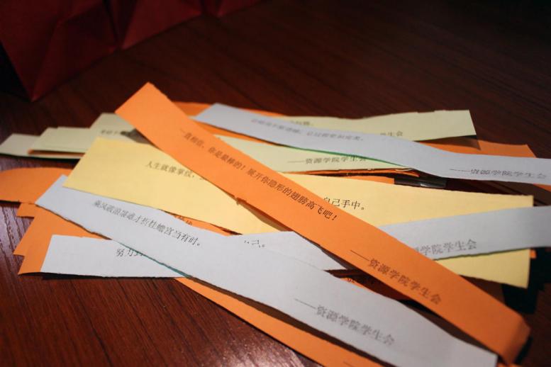 “不服输、熬过黑夜是日出”“愿君成功,真心遥祝,昂首阔步,辉煌前途”……纸条窄窄,话语温暖,以笔笺心,以书传情,学院学生会在组织策划忙碌的同时不忘为学长学姐送去暖暖的文字祝福。