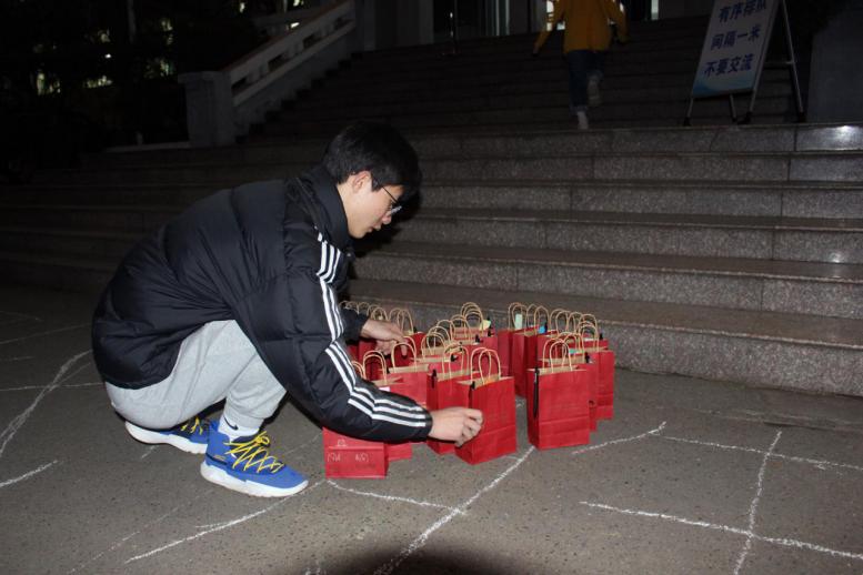 夜色深沉,学院学生会成员不畏严寒,依旧在教学楼前摆放福袋,只为明早的第一缕阳光照射大地时,考研学子看到此情此景,能够会心一笑。