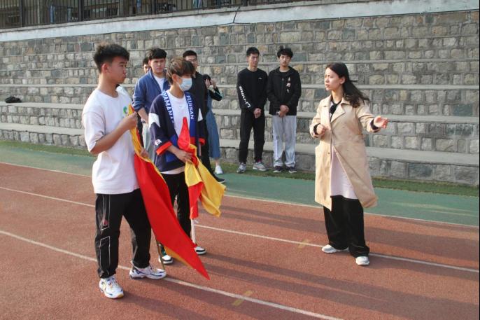 “挥舞动作要整齐有力,队形变化要迅速有序,大家要用手中彩旗舞出学院气势与风采。”张娜老师认真观看舞旗训练,为队员们提出指导意见。