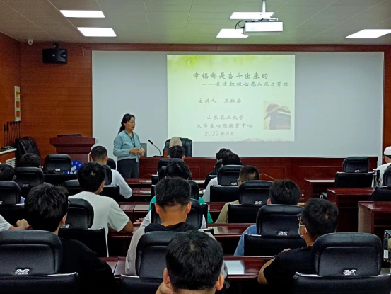 报告以“幸福都是奋斗出来的”为题,从“学习与工作的关系”“与他人的关系”“与自己的关系”三方面出发,教育引导学生要充分认识和了解自己,保持积极心态,学会自我压力管理。王红菊指出,要想保证心理健康,就要拥有足够的适应力,善于从经验中吸取教训,还要保持良好的人际关系。同时,她通过带领大家体验多种减压方法,指导同学们调整自我心理状态、保持平和心态,高效投入到学习生活中。