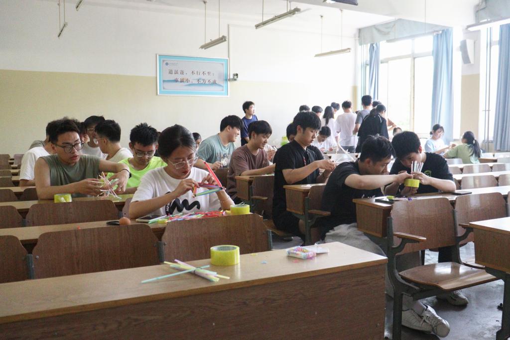 25支队伍参赛队伍分成A、B两组,其中A组选手仅可使用吸管、橡皮筋、胶带三种工具;B组选手参赛工具不限。比赛要求选手在规定时间内将作品设计组装完成,确保鸡蛋由三楼抛至地面后能够保持完整。比赛过程中,选手们默契配合、通力合作,结合所学结构设计专业知识,充分发挥创造力,将缓冲方法、降速原理与实际结合,制作出了各种精妙的装置。赛后,裁判根据设计理念、作品质量、鸡蛋破损情况、落地时间等进行评分。